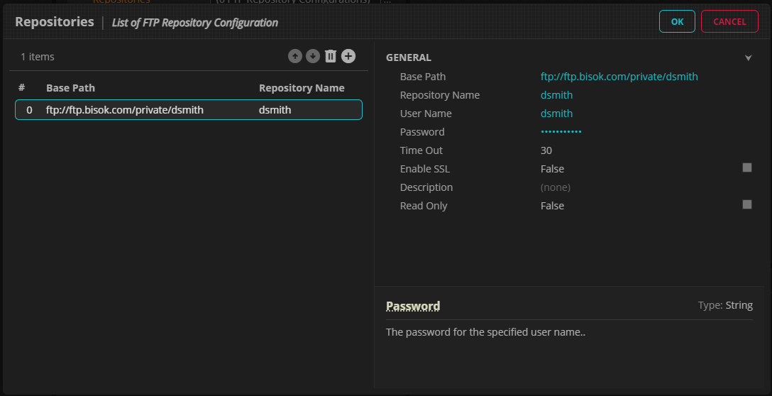This brings up the "FTP Repository Configuration Collection Editor". Here, you can enter one or more FTP paths to be used as the repository's root. You will also need to enter the user name and password to access the FTP server. The repository's name will default to the end destination folder. Or, you can name the repository under "Repository Name". Press **Add** to enter a new path, establishing the folder at the end of that path as a repository.