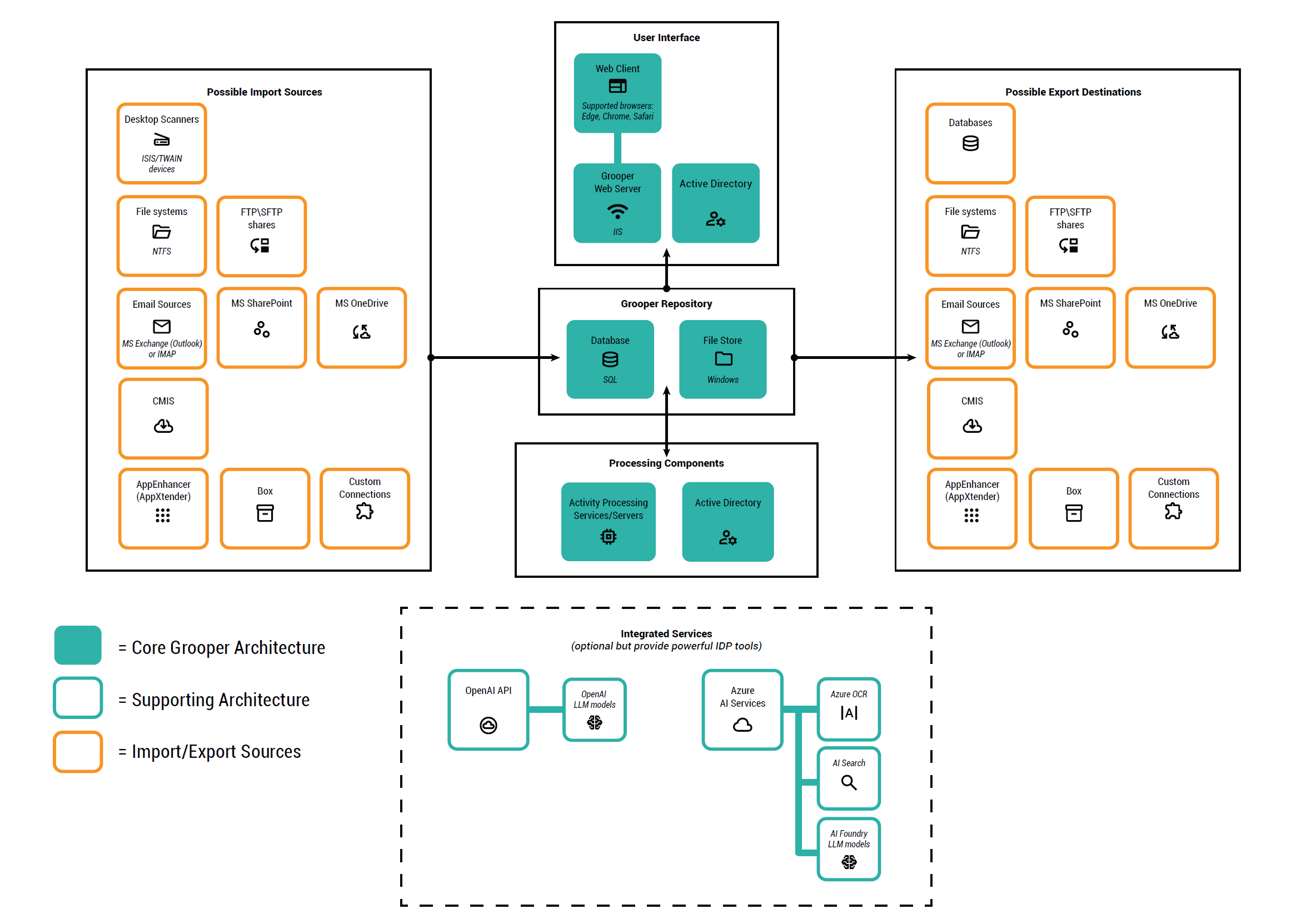 There are several components that make up a Grooper system's internal infrastructure: the Grooper database, the Grooper file store, the Grooper web server, etc. There are also several external resources Grooper connects to. This includes import and export sources and LLM (large language model) providers used in Grooper's AI-based features.