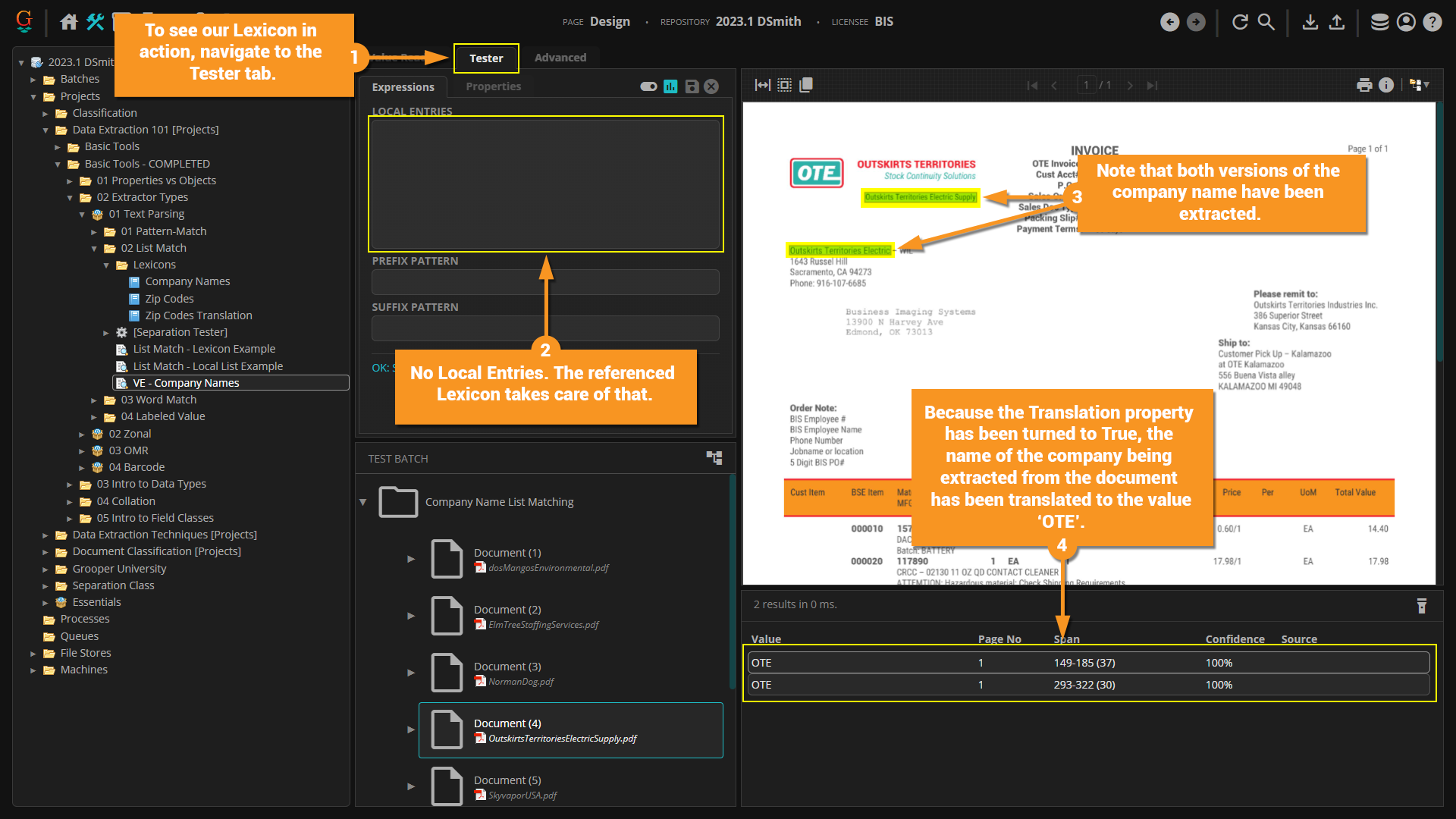 4. With the Translation property turned to true, instead of each version of the company name being output as it appears on the document, it's been translated tot he value we set in the Lexicon.