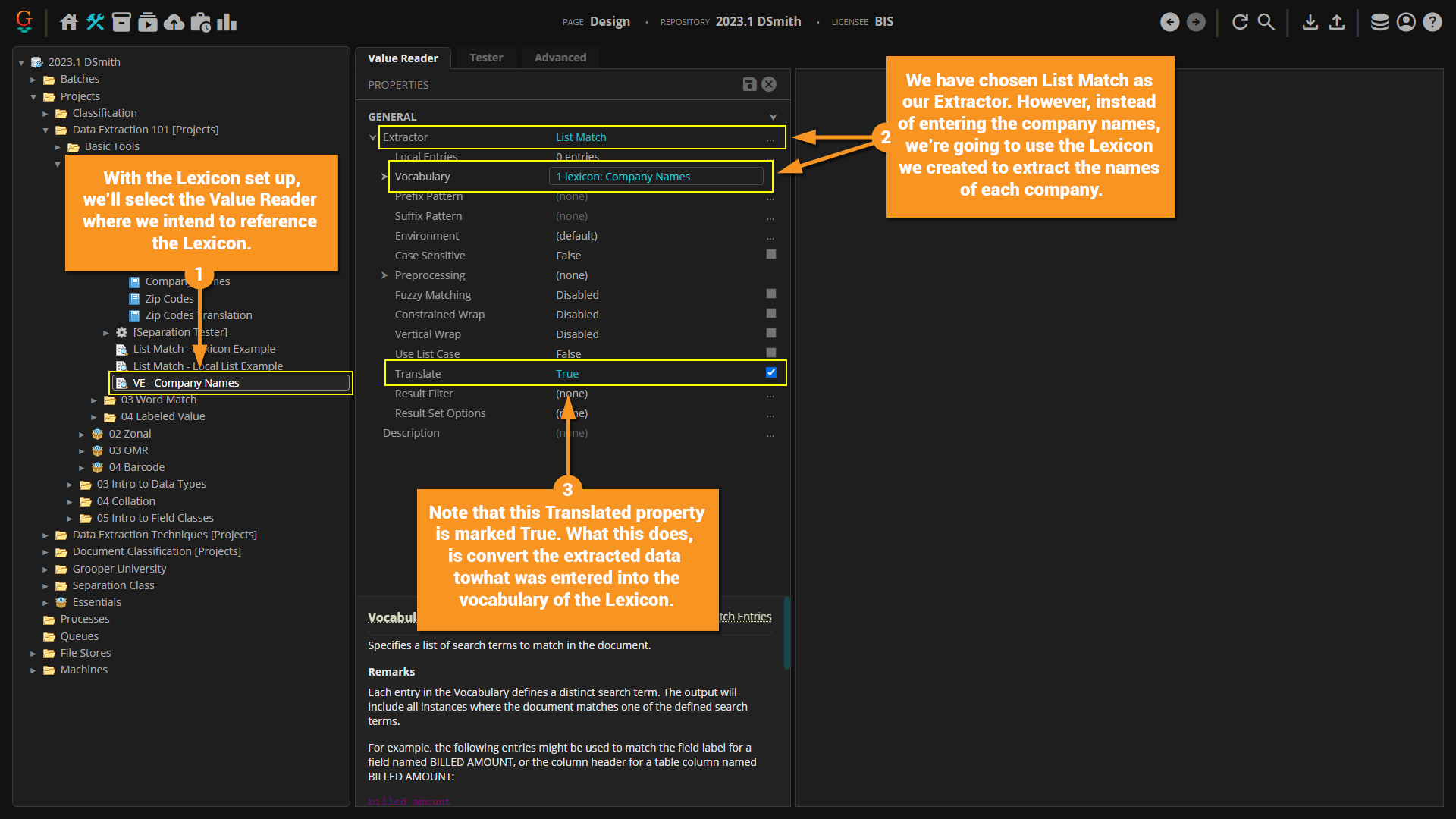 1. With the Lexicon set up, let's move down to the Value Reader where the extraction of the company names will take place. To keep it simple, we've named it VE - Company Name.