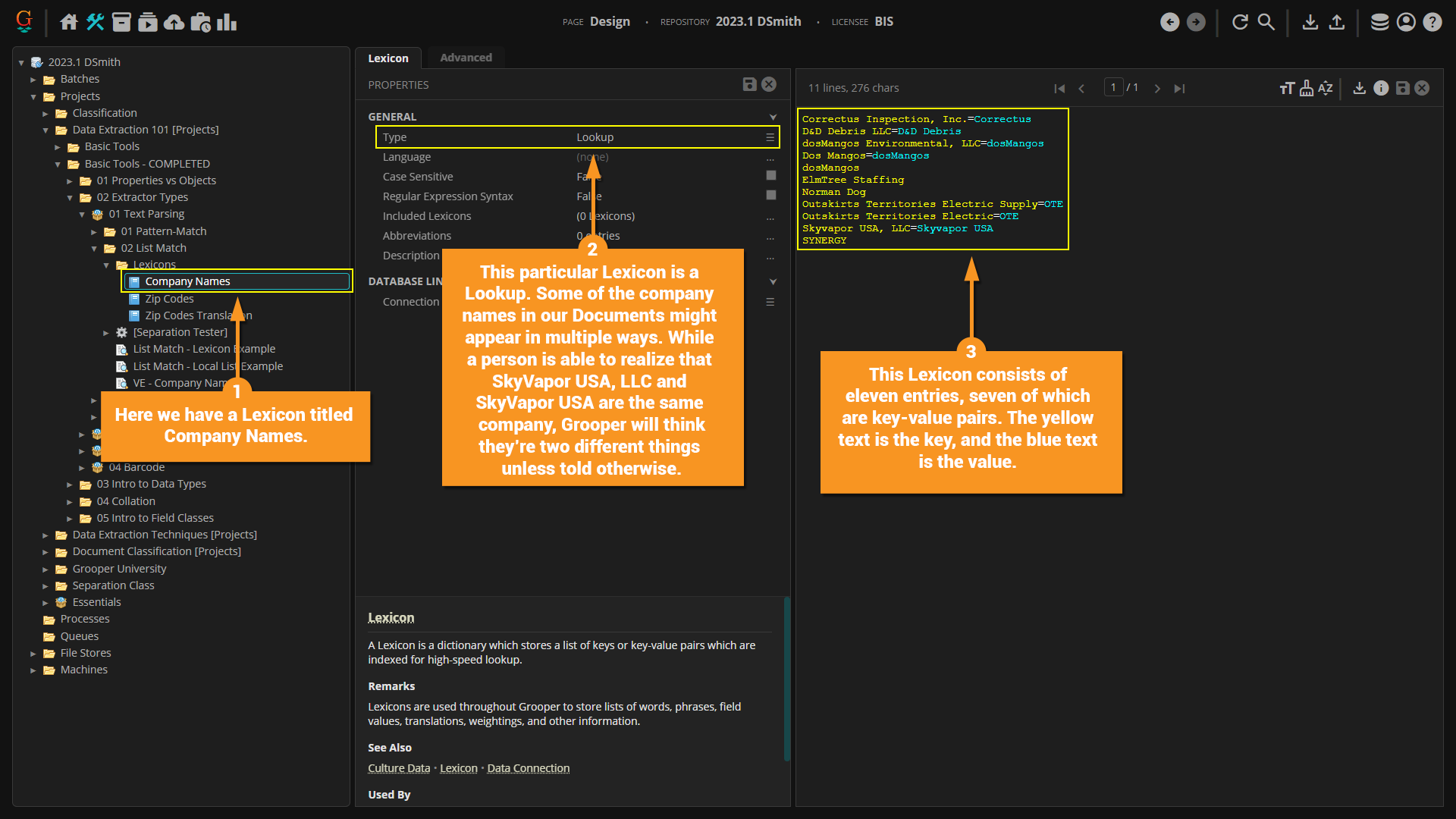 3. Lookup Lexicons consist of key-value pairs, where the keys are in yellow text and the value in blue; it's a way of telling Grooper that one piece of string data is equivalent to another. "XYZ Company, LLC = XYZ" for instance.