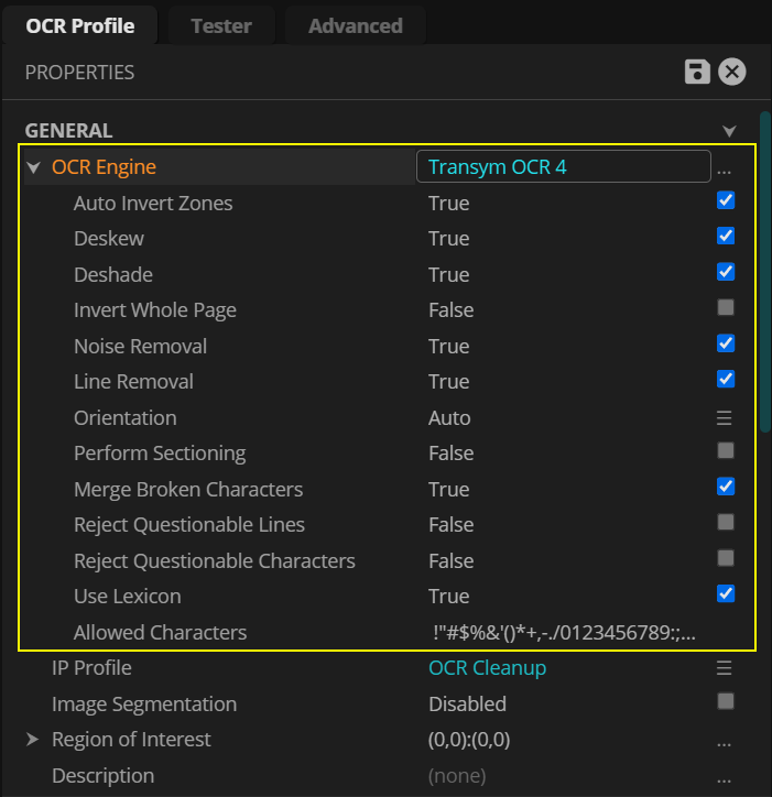 This OCR Profile does not use any of settings. However, they are highlighted below.