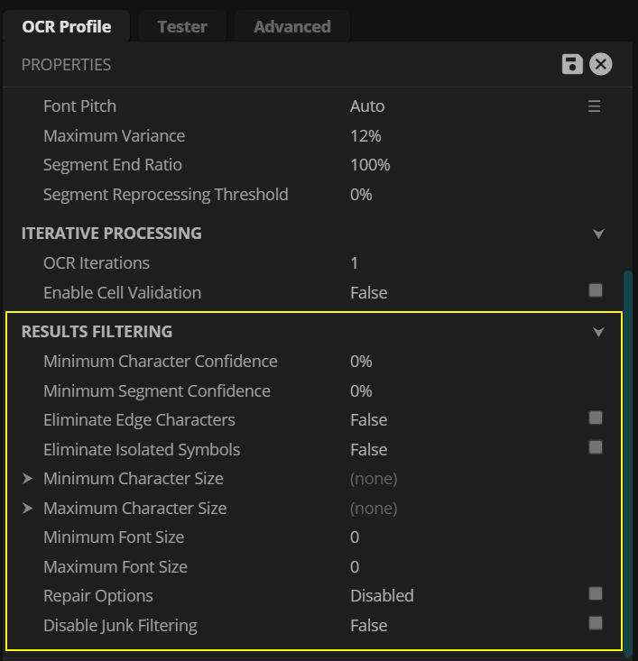 The Result Filtering settings allow you to isolate certain characters and remove them from your results. Maybe you want to discard any characters that do not meet a minimum confidence score. Maybe you want to discard all characters below a certain font size. Maybe you want to discard all characters within a certain distance to the edge of the page. You can do those things (and more) using these Result Filtering settings.