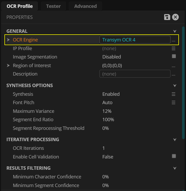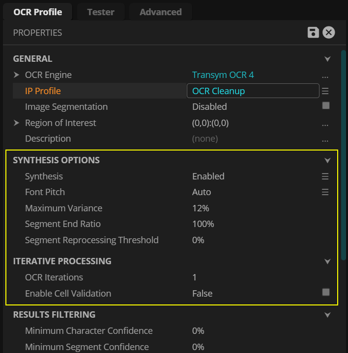 This OCR Profile uses a variety of these Synthesis properties, all of which are highlighted in yellow. To learn more about this suite of properties, what they do, how they improve OCR results, and how to configure them, visit the Synthesis article.
