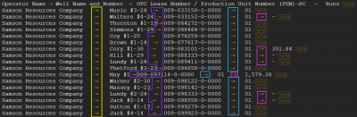 More specifically, we need to find something in one of these five columns to anchor off of. We need to target at least one piece of information we can use to pattern the whole row. Let's try and find the cell that has a fairly specific pattern to match. The "Operator Name" and "Well Name" seems extremely variable. The name of the well operator could be anything. It could be made of letters, numbers, special characters. Who knows? And the well name has a similar problem. "PC" looks like it's reliably two digits, but the "Lease Number" and "Runs" columns would also match a regex that is just two digits. The "Runs" column presents its own problem because not every row has a value in that column.